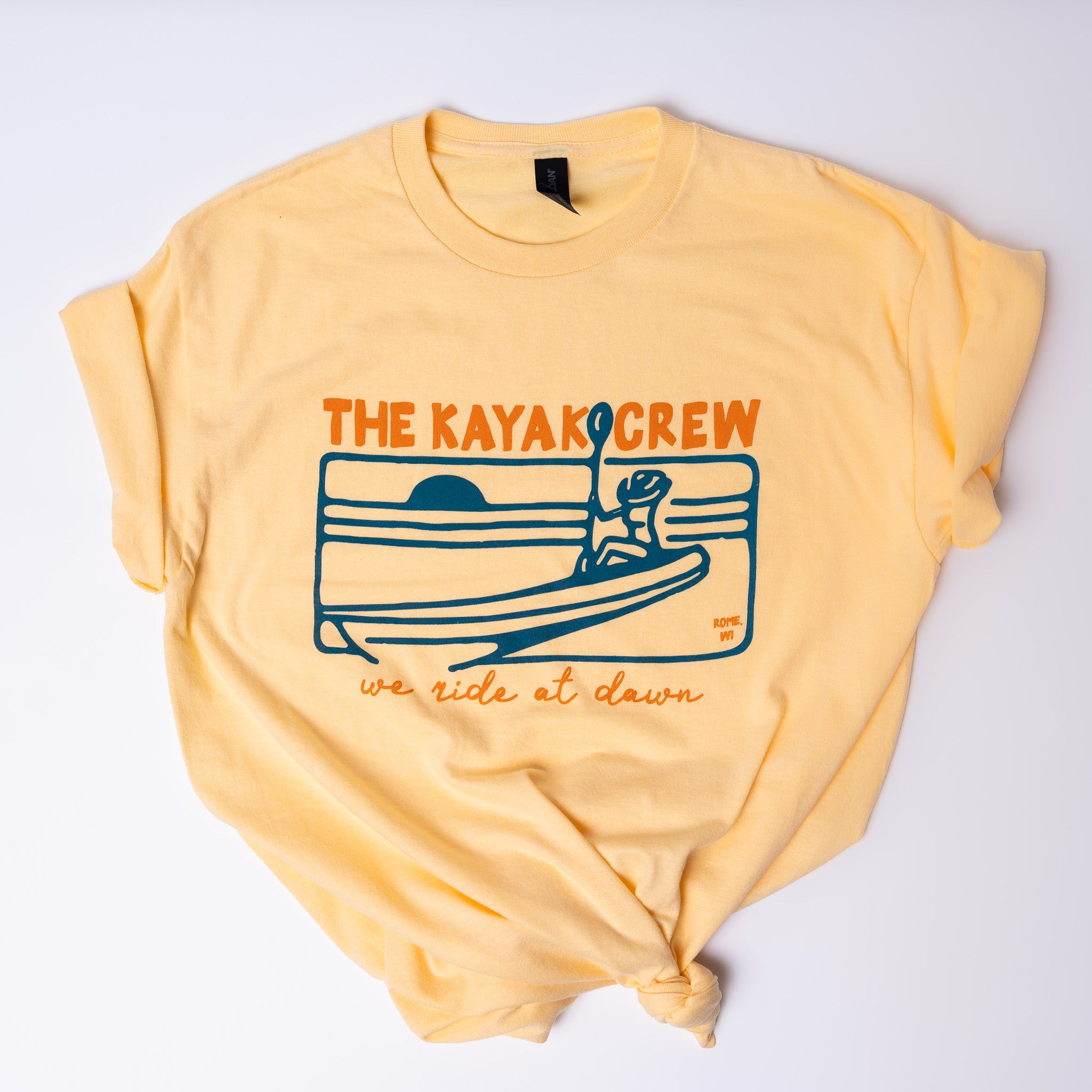 Stand out on the water with the Kayak Crew - We Ride At Dawn tee. This cute, comfy shirt made from soft Gildan cotton features a bright yellow color that keeps you visible and full of fun wherever you paddle.