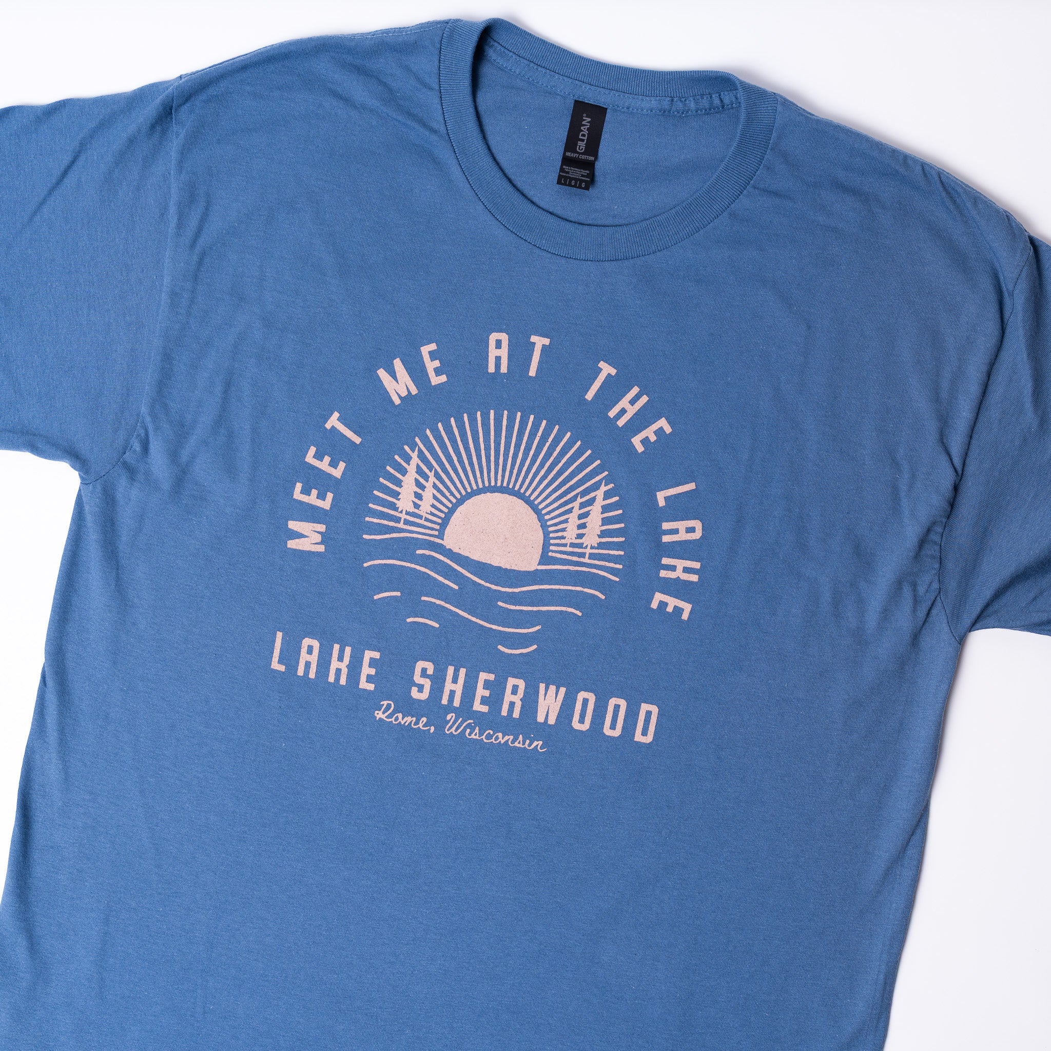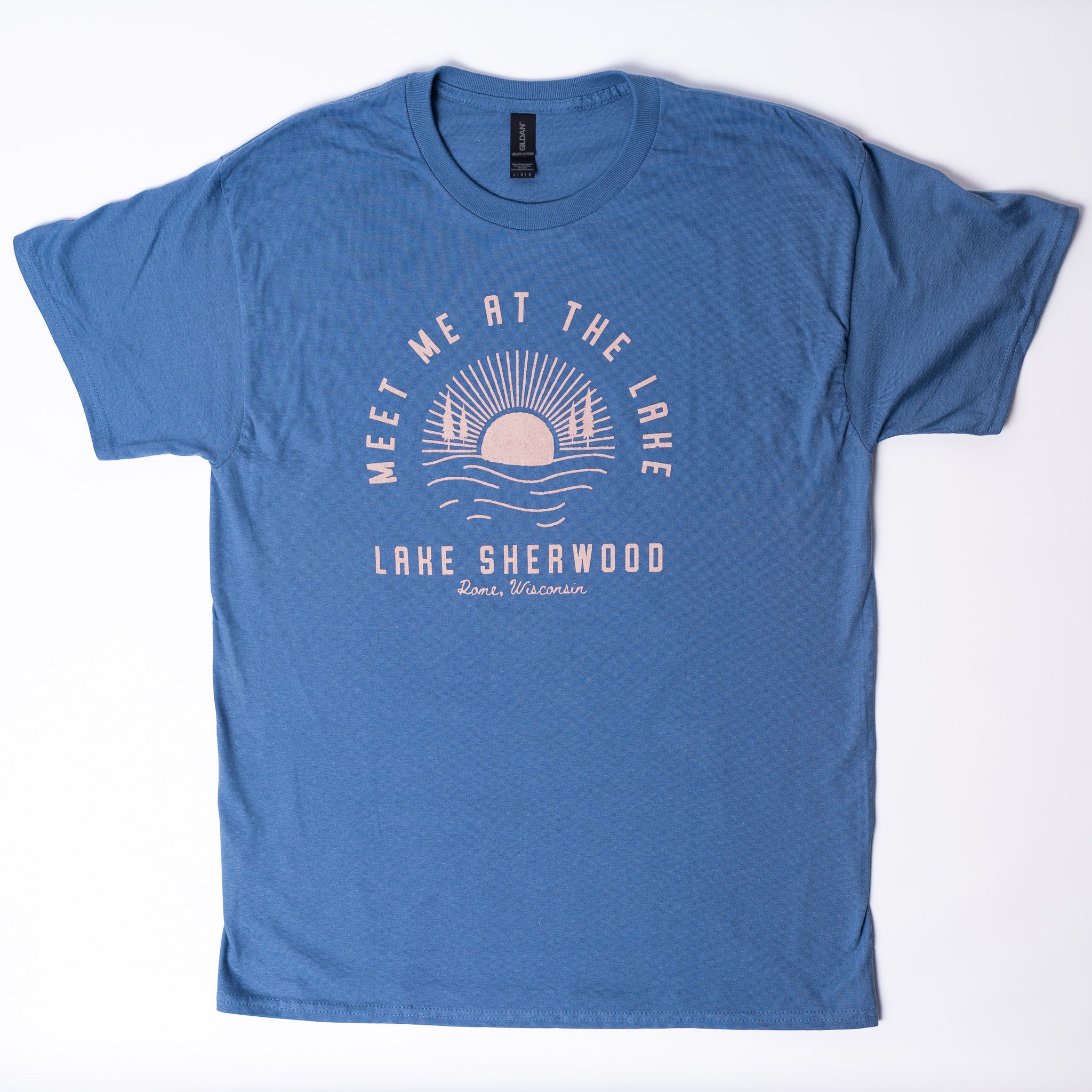 The "Meet Me at the Lake" tee showcases a rich blue shade with a khaki print honoring Lake Sherwood. This tee is perfect for those who appreciate subtle style and meaningful places.